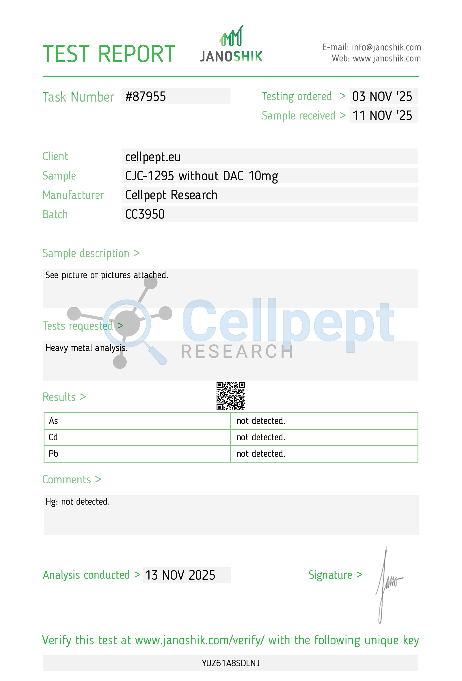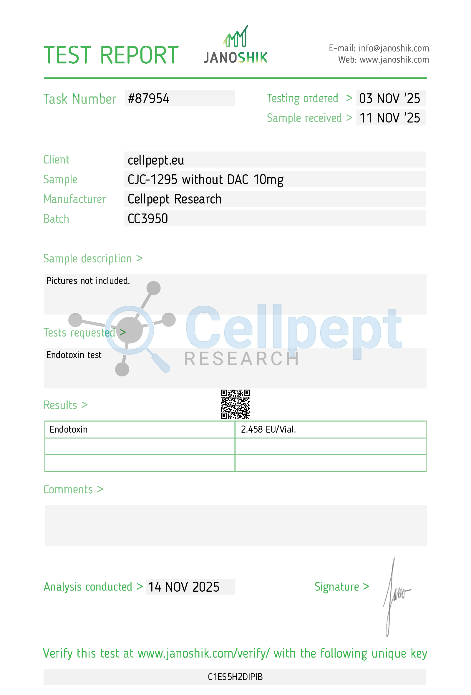 Janoshik test resuls CJC no DAC 10mg Endotoxins